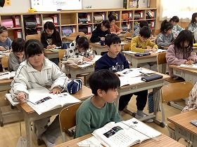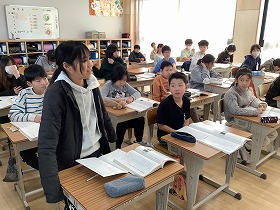 4年生も来週5日(木)の学校公開日でまとめ学習の発表をするので、5年生の発表を真剣に聞いていました。